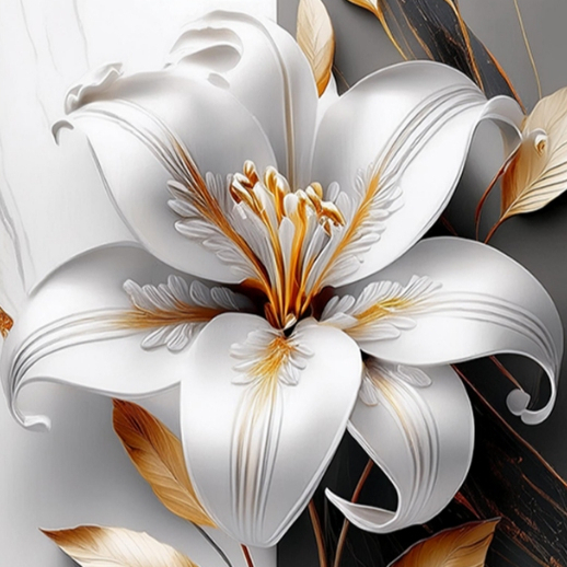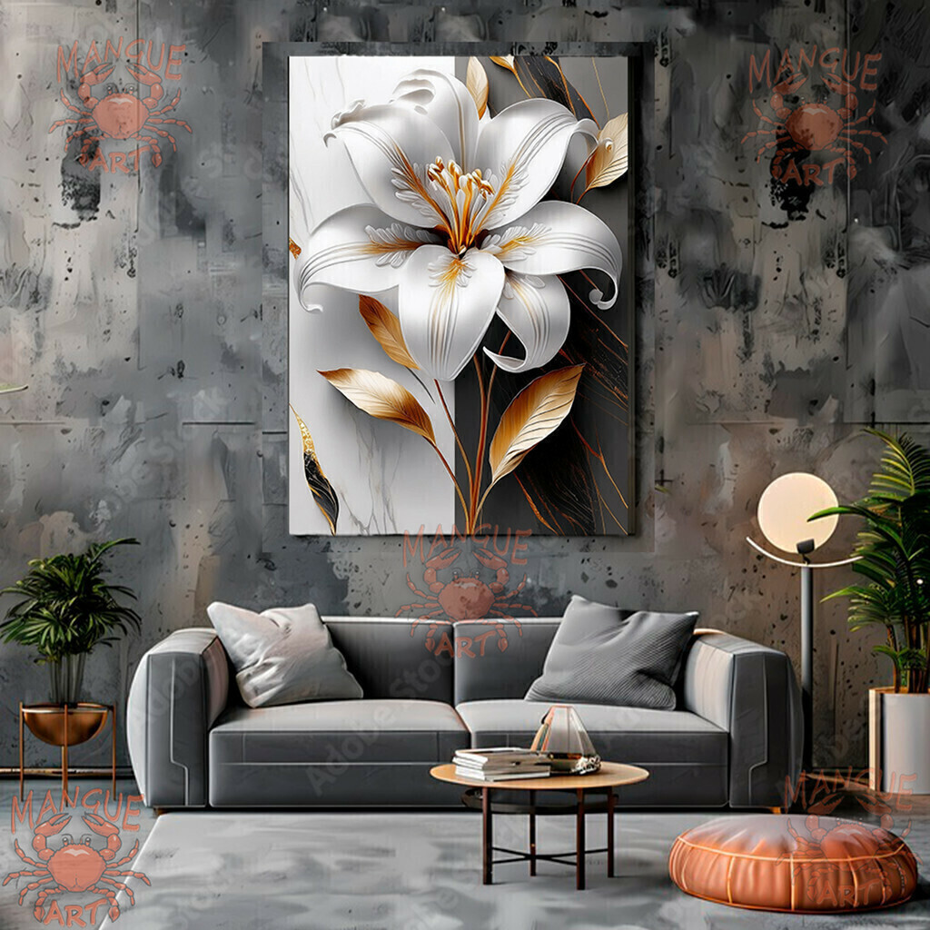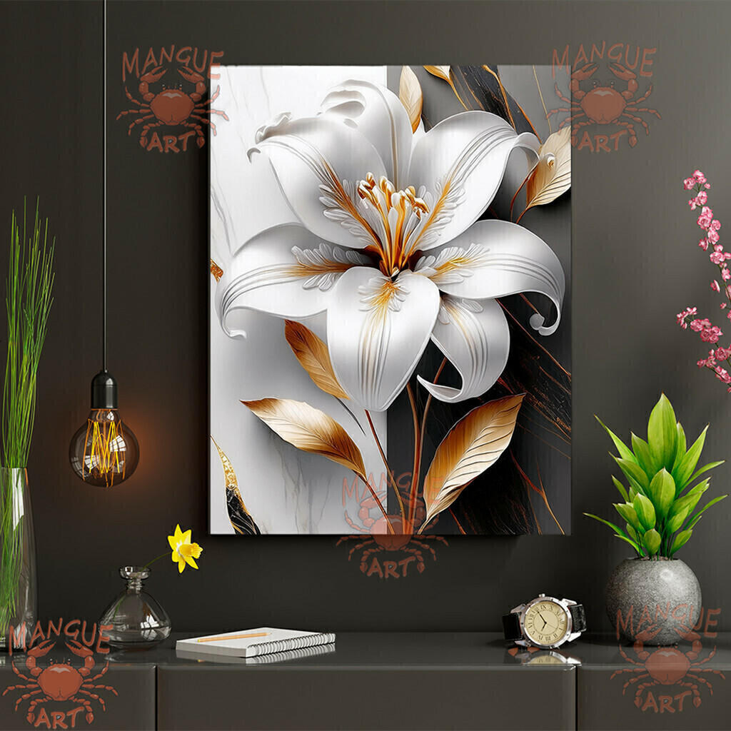 O quadro “Lírio Branco e Dourado” traduz em forma e cor toda a beleza da natureza com um toque refinado de luxo. O lírio, símbolo de pureza, renovação e paz, surge destacado em tons brancos suaves e detalhes dourados que remetem à nobreza e sofisticação. Essa obra é perfeita para quem deseja compor ambientes leves, serenos e ao mesmo tempo elegantes.