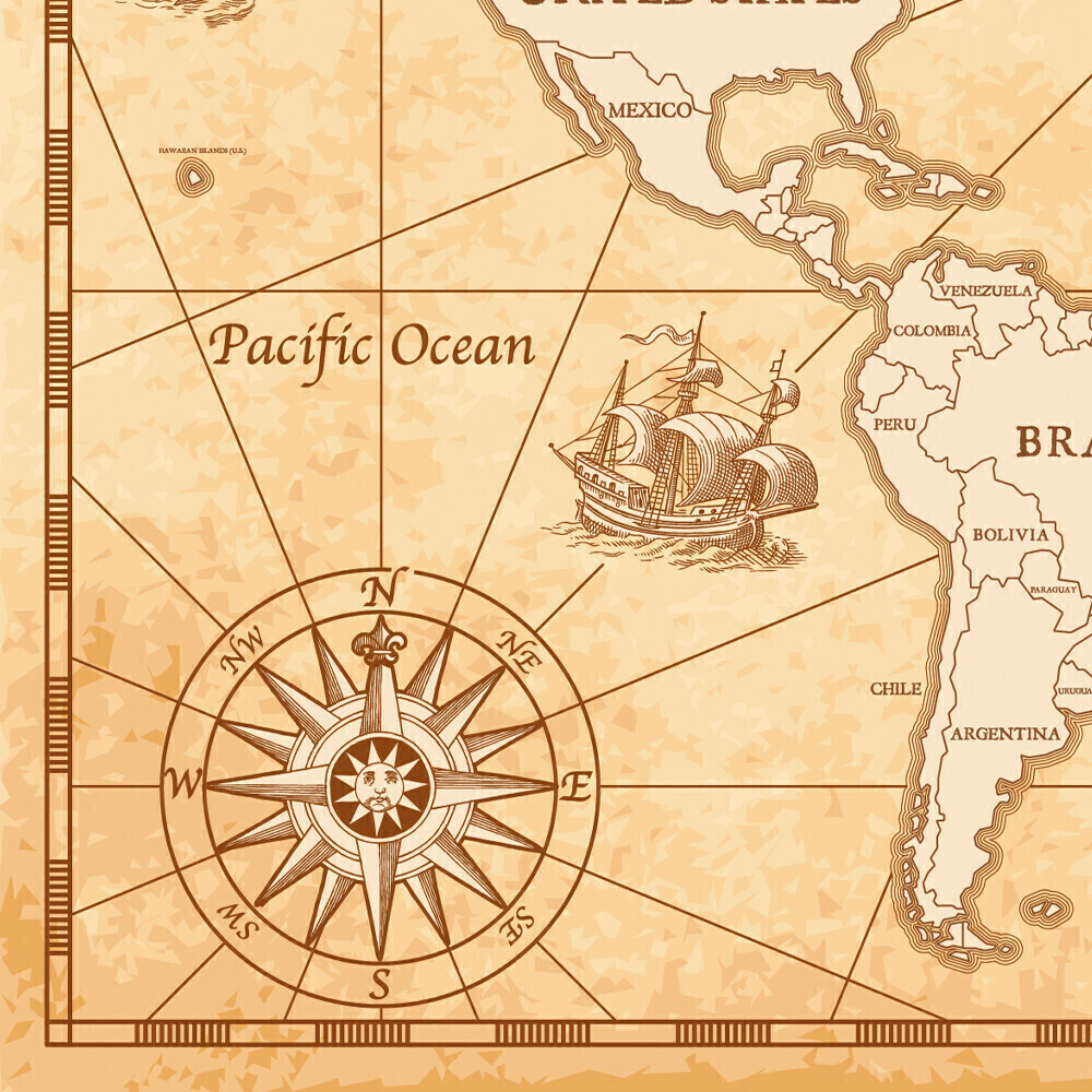 A impressão em tela acetinada de alta definição valoriza os detalhes cartográficos e a textura envelhecida, proporcionando um brilho sutil e elegante que ressalta a beleza da arte em qualquer ambiente.