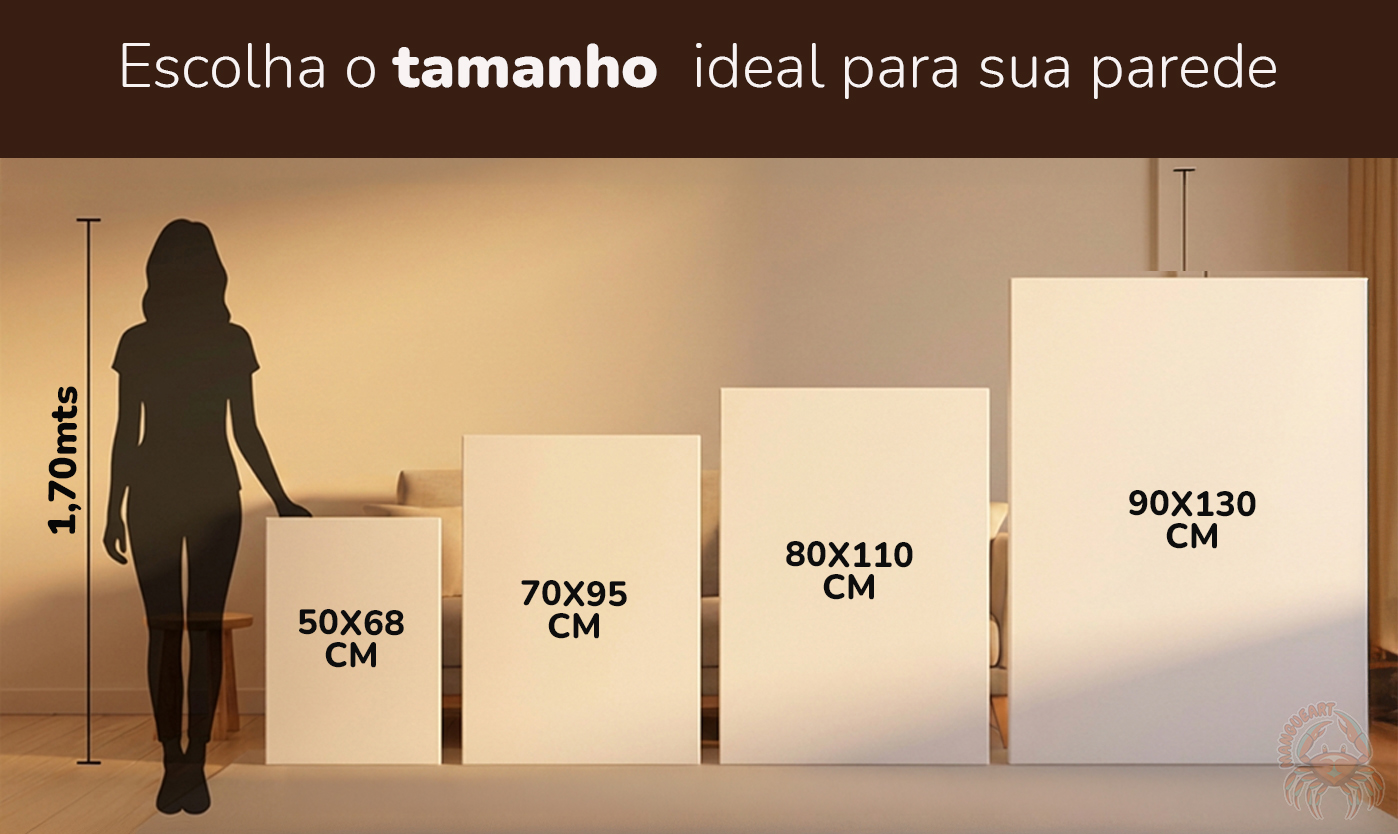 A tela acetinada proporciona um brilho sofisticado e discreto, valorizando cada detalhe da obra. As laterais são finalizadas com borda preta ou com a própria imagem, dispensando moldura.