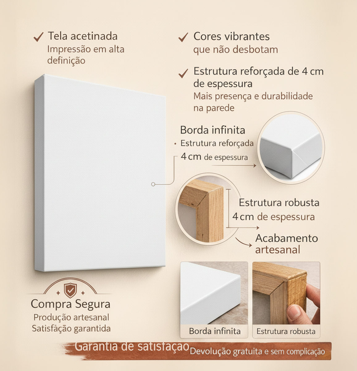 As laterais podem ser finalizadas com borda preta ou continuidade da arte, criando efeito galeria.